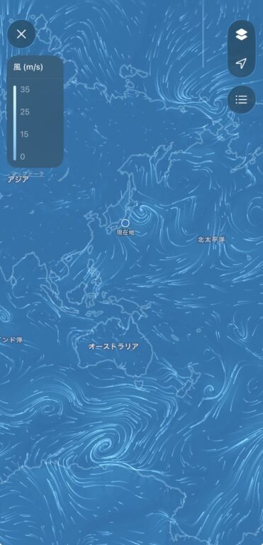 iPhoneの「天気」で見られる「風」面白すぎ! 前線と思われるところでは、風がほとんど直角に曲がったりしてる。あとやっぱ風って海上が凄まじいんだなあ。