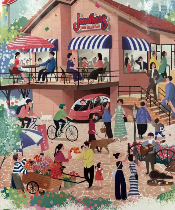 ジョナサンメニューの、素敵な表紙。花屋やギター演奏者など、画面の下半分は経営上ジョナサンとまったく関係がないが、服装やパラソルなどに青と白の縞模様が配されていることによってあたかもジョナサンブランドの世界観の一部であるかのような印象を発している。警戒セヨ。