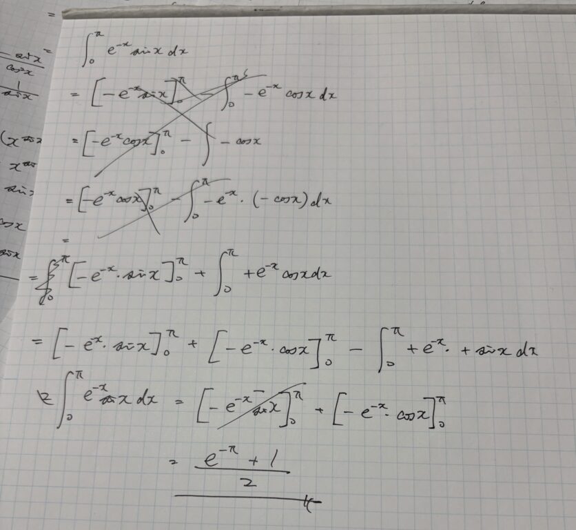 部分積分を二回すると同形出現する例。ウワー! こんなの受験じゃん。受験期は数学が一番苦手だったな。好きなはずなんだけれど、なぜだか点数的には全科目のなかでいちばん脚を引っ張っていた。