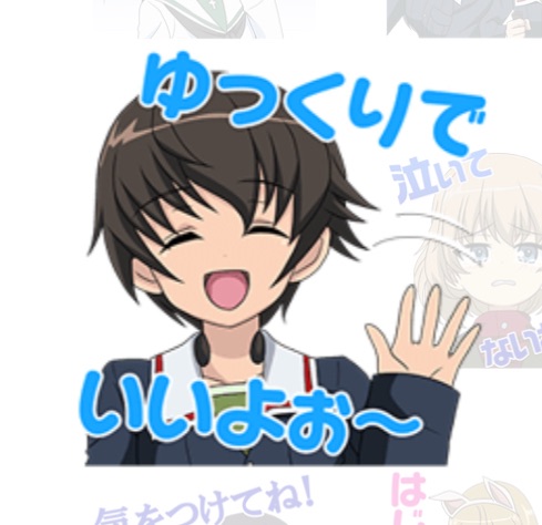 パートナーがよくこの「ゆっくりでいいよお〜」スタンプを送ってくるのだが、これはラストの黒森峰女学園戦で、ポルシェティーガーが撃破された後もなるべく自身の装甲で道を塞ごうとしていたため、「(車両回収チームの到着は)ゆっくりでいいよお〜」という意味だった。この時間稼ぎのおかげで、みほのⅣ号戦車とまほのティーガーⅠの一騎打ちが実現したのだ……。