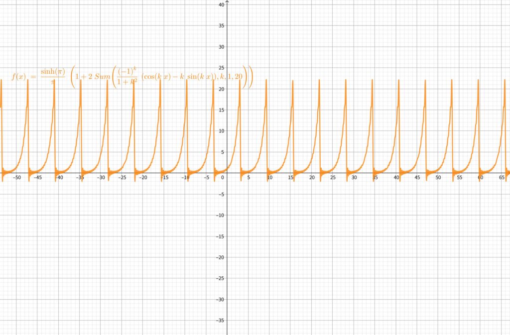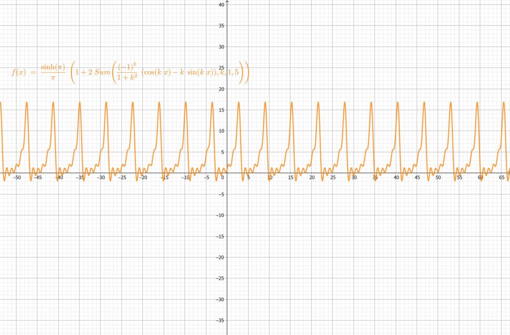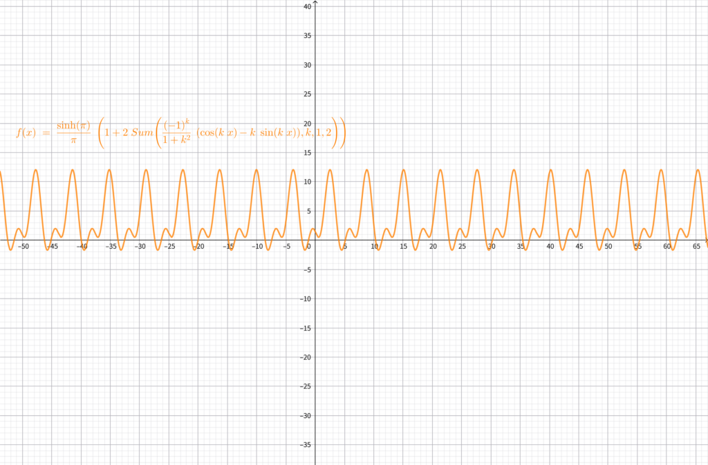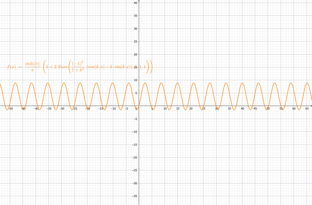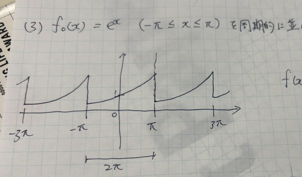 計算することができる。三角関数を無限に足していくことで、上のギザギザ曲線を「eのx乗を周期的に並べた関数f(x)」と言葉で指示する必要なく、一本の数式で表せる。