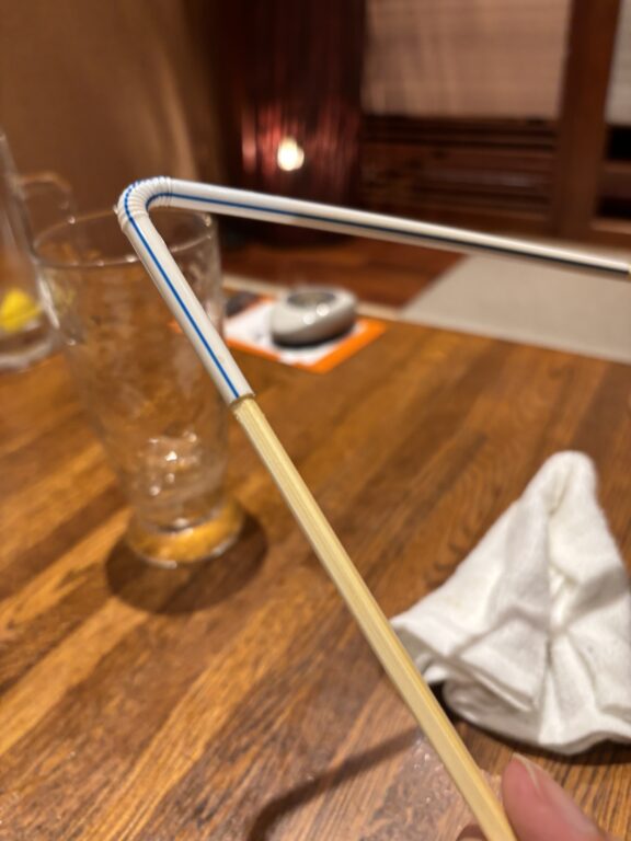 無意識にストローに割り箸挿していたら、tさんが同じことをしてくれた。回していた。「回転軸が二つあって機構になってますね」と感心していた。