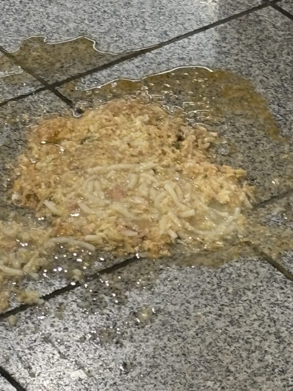 駅にゲボあった! 偏ったものを食べている。細いのはピザのチーズ? 麺類っぽくもある。うどんかも。