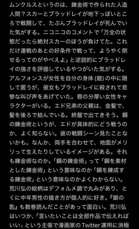 鋼の錬金術師を読んだことのない自分が鋼の錬金術師について知っていることを洗い出したメモとかもある。