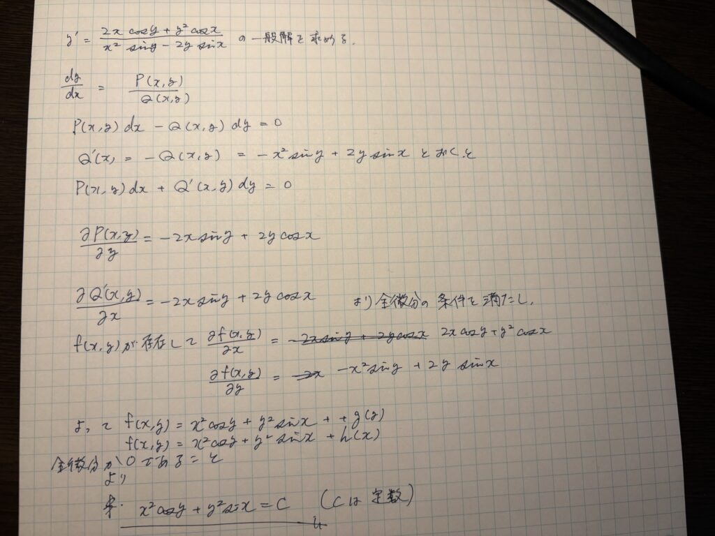 全微分を利用した微分方程式の解法。普通の導関数を積分すると積分定数が生まれるけれど、それと同じノリで、偏微分された導関数を積分すると偏微分されなかった方の変数にのみ依存する関数が生まれるのか。