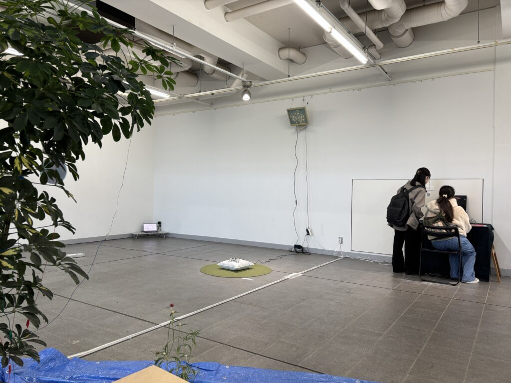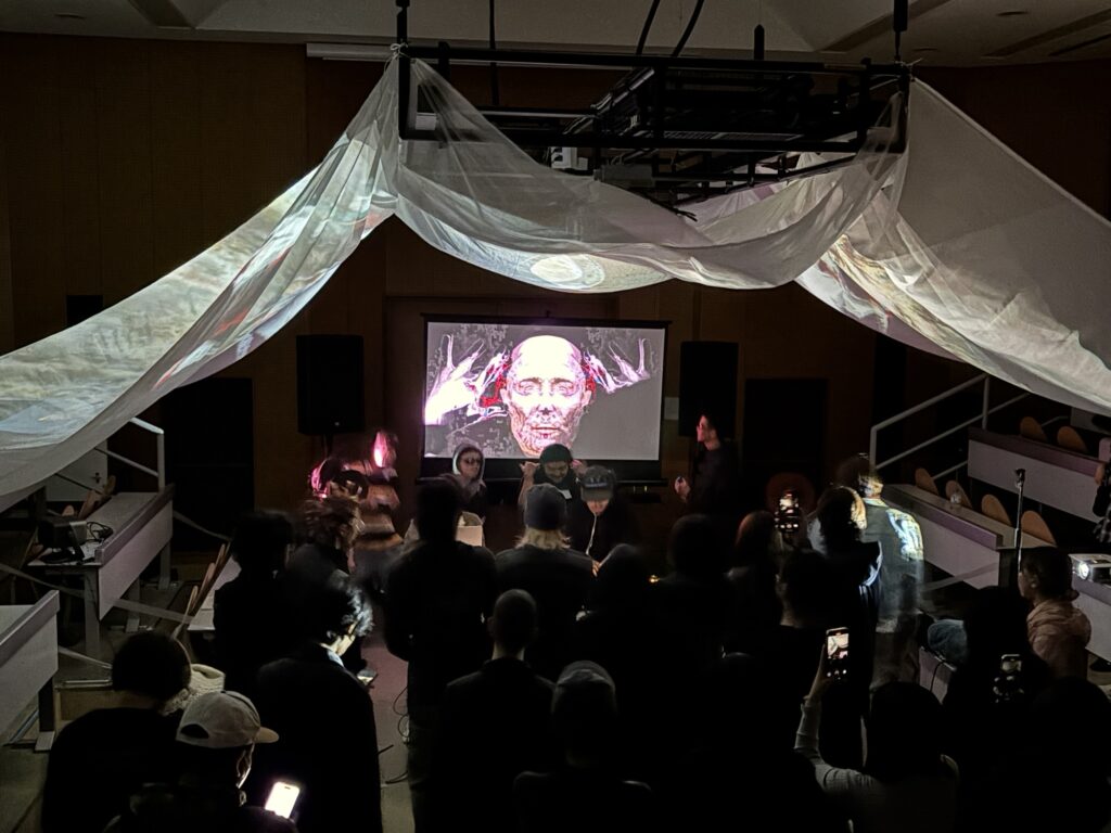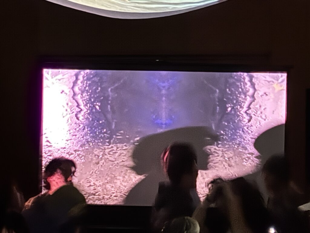 在廊するのに疲れたので、昨年も行ったテクノ研究会のDJ/VJブースに行って休んだ。爆音のなか、ターンテーブルの周りで人々が体を揺らしていた。後ろ髪を結んでいた男性が、それをほどき、髪を左右に揺らしながらビートに乗った。まるで僕とは違う人種の集まりだな〜と思いつつ、音楽も映像も良いので端っこで40分くらい見ていた。踊るのは恥ずかしくてできなかった。ビートの低音でズボンの裾が毎回揺れた。