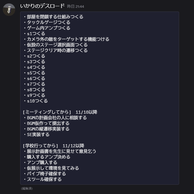 20分くらい何もしてなかった。目を開いたタイミングで、↑の雑な方針を具体的なタスクに書き直してみた。実際に行動するときはそれぞれをさらに細かくしていくと思う。物理媒体の準備は次に学校に行く日まで置いておく。BGMは会社の人とのミーティングから考える。タスクを縦に並べていく。一つずつこなしていけるように。