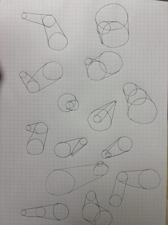 台風の予報円が気になって、3つの円をそれぞれ接線で結んでつなげるということをした。