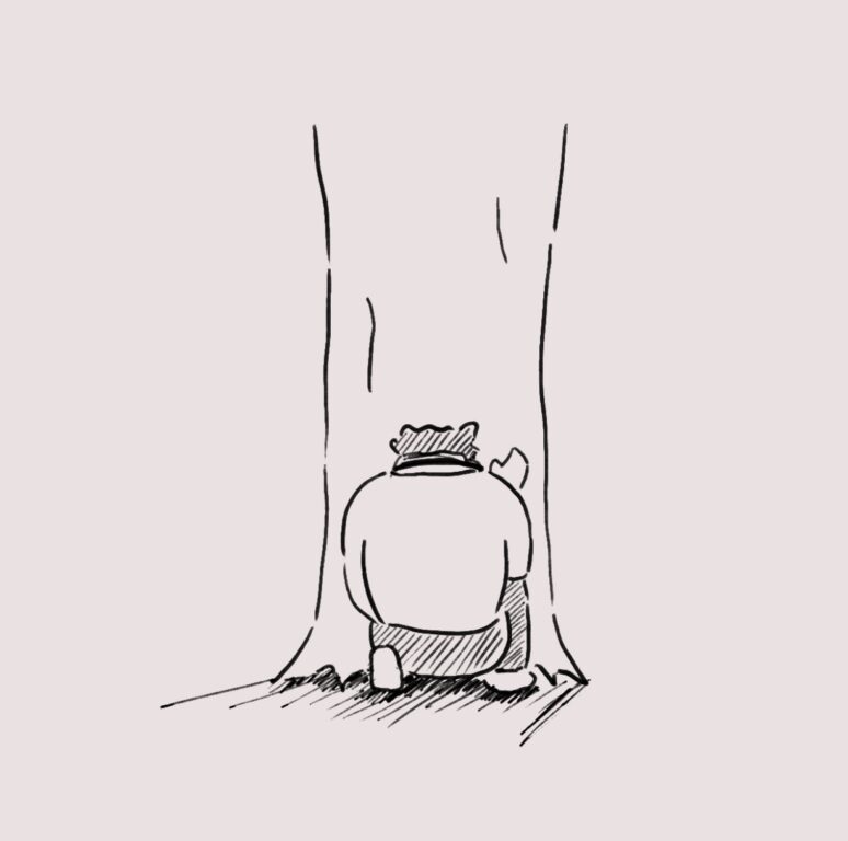 帰り道、寺の境内で、中年男性が太い木の幹の下にしゃがみこんでいるのを見かけた。