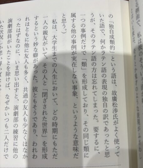 「独自性類的」という語は〜(中略)、何かラテン語の表現の独自の訳であったと思うが、そのラテン語の方は忘れてしまった。要するに、一つの事例だけで「類」を形成しており、その同じ類に属する他の事例が実在しない事象、というような意味だと思う。