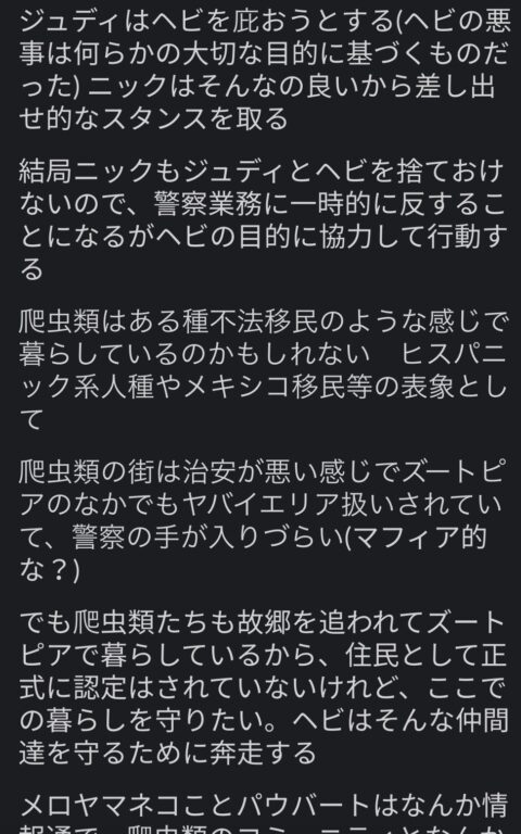 シテワさんとあとで話して共感したけれど、主人公のジュディはあまり納得いく言動をしない。『ズートピア』の物語は正義感が強くて突っ走るタイプのジュディと、皮肉屋でニヒリストなニックという凸凹コンビがタッグを組むという構図だと思うけれど、我々からすると、ニックの言動はわりと常識の範囲内だった。ニックはただのいい狐に見えて、ジュディの多動さや周りの見えてなさが一方的に非常識に映った。これはきっと、大人と子供で共感できる位置が違うのだろうな。子供の観客からすると、ジュディは標準的な主人公で、ニックは彼女の行動になかなかコミットしようとしない怠け者のように映っていたのかもしれない。