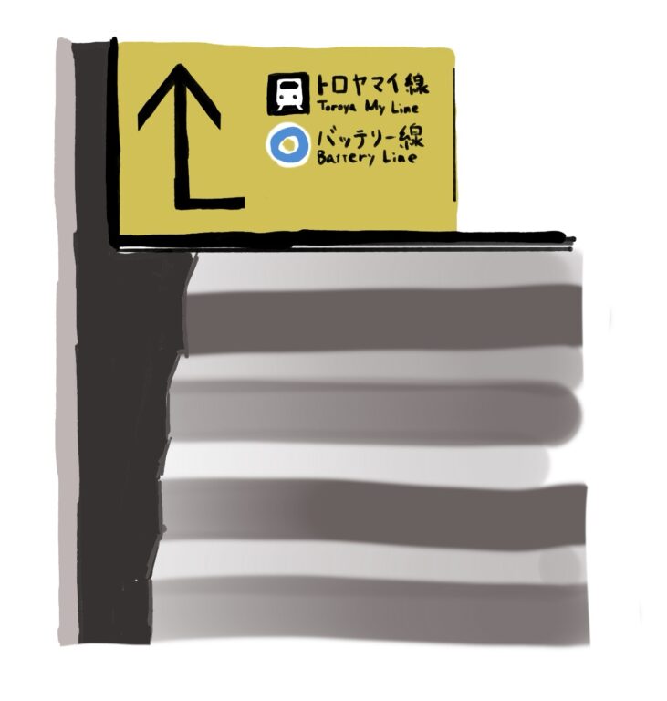 それを聞いて、確かにテさんのような解釈もありだなと思った。案内表示板で使われる矢印は、どうしても現実より一つ小さい次元で表現しないといけないので、指示を一意に定めるのは難しそう。単なる「↑」があったとして、それが「上向き」を指しているのか「奥向き」を指しているのかもわからない。ましてや上り階段のところにある「↑」は、どっちの意味にとっても同じ結果になる。そこで「↑」の指示方向を「上」と学習してる人と「奥」と学習してる人が割れていそう。
