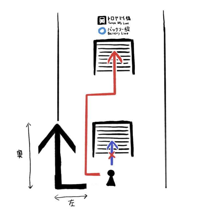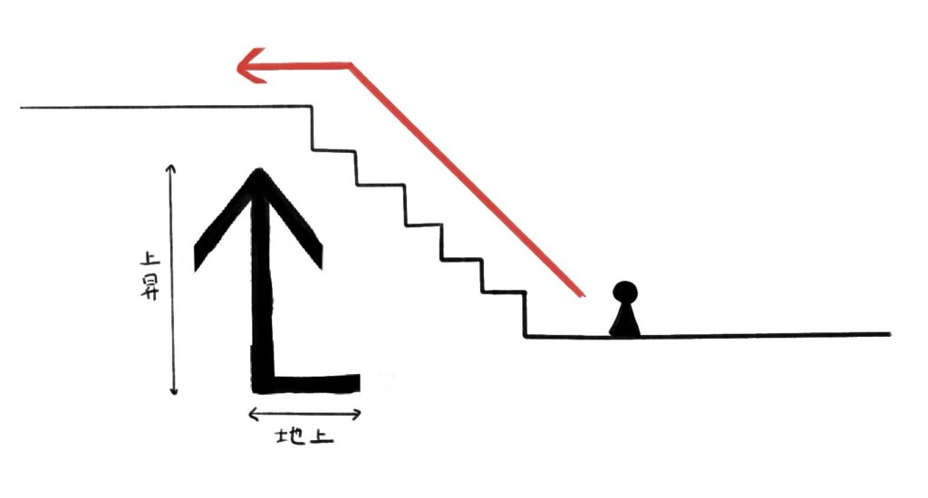 テさんはこのように単に「上階へ行け」という指示だと解釈していた。矢印の縦棒を、高さの表現と感じたらしい。